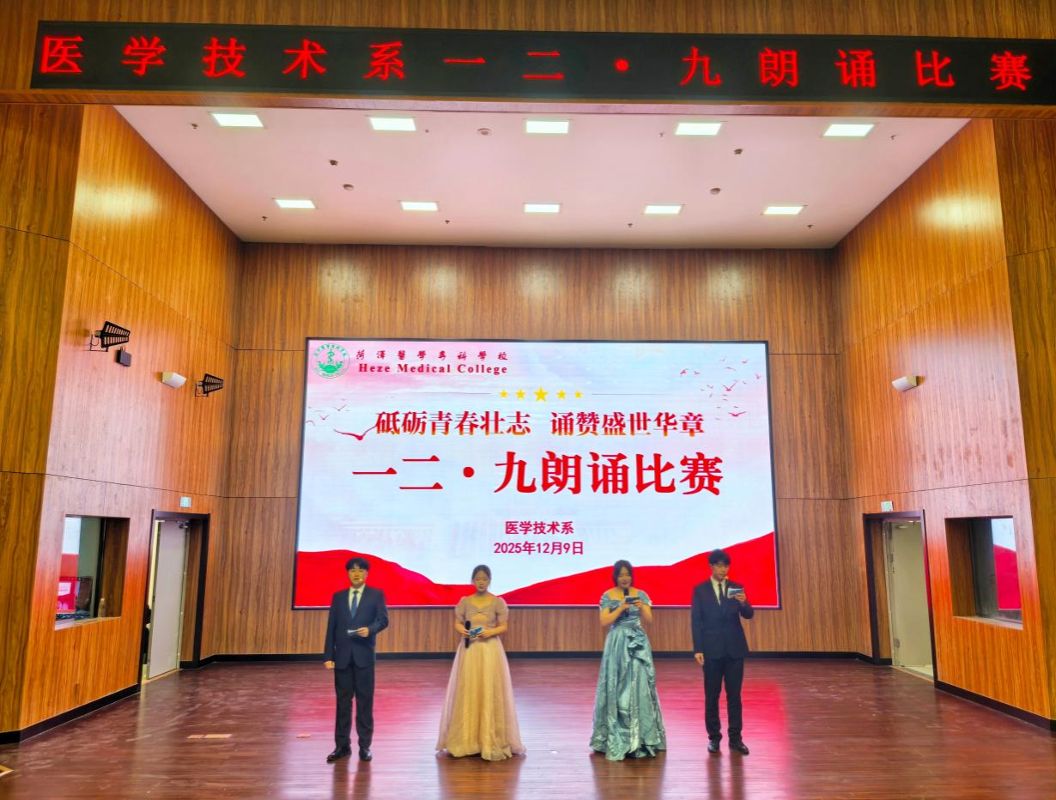 比赛在庄严而热烈的氛围中拉开帷幕,《红铁》铮铮,铸就不屈脊梁;《万疆》辽阔,描绘山河锦绣;《青春铸剑,华章诵国》深情诉说青年满腔热忱;《十二月的火炬》熊熊燃亮薪火相传的信仰,选手们以饱满的激情、精湛的朗诵艺术,生动展现了“一二·九”精神在新时代的回响,抒发了菏医学子炽热的家国情怀和昂扬的青春风貌。通过激烈的角逐,2025级康复治疗技术1、2班获得一等奖,2025级医学影像技术3、4班等三组队伍获得二等奖,2025级康复治疗技术3、4班等四组队伍获得三等奖。