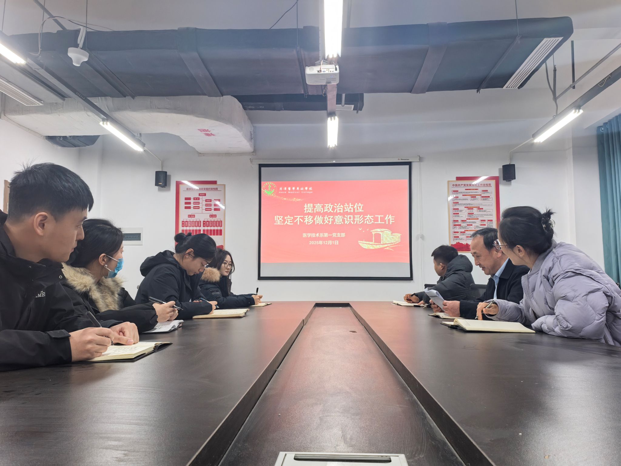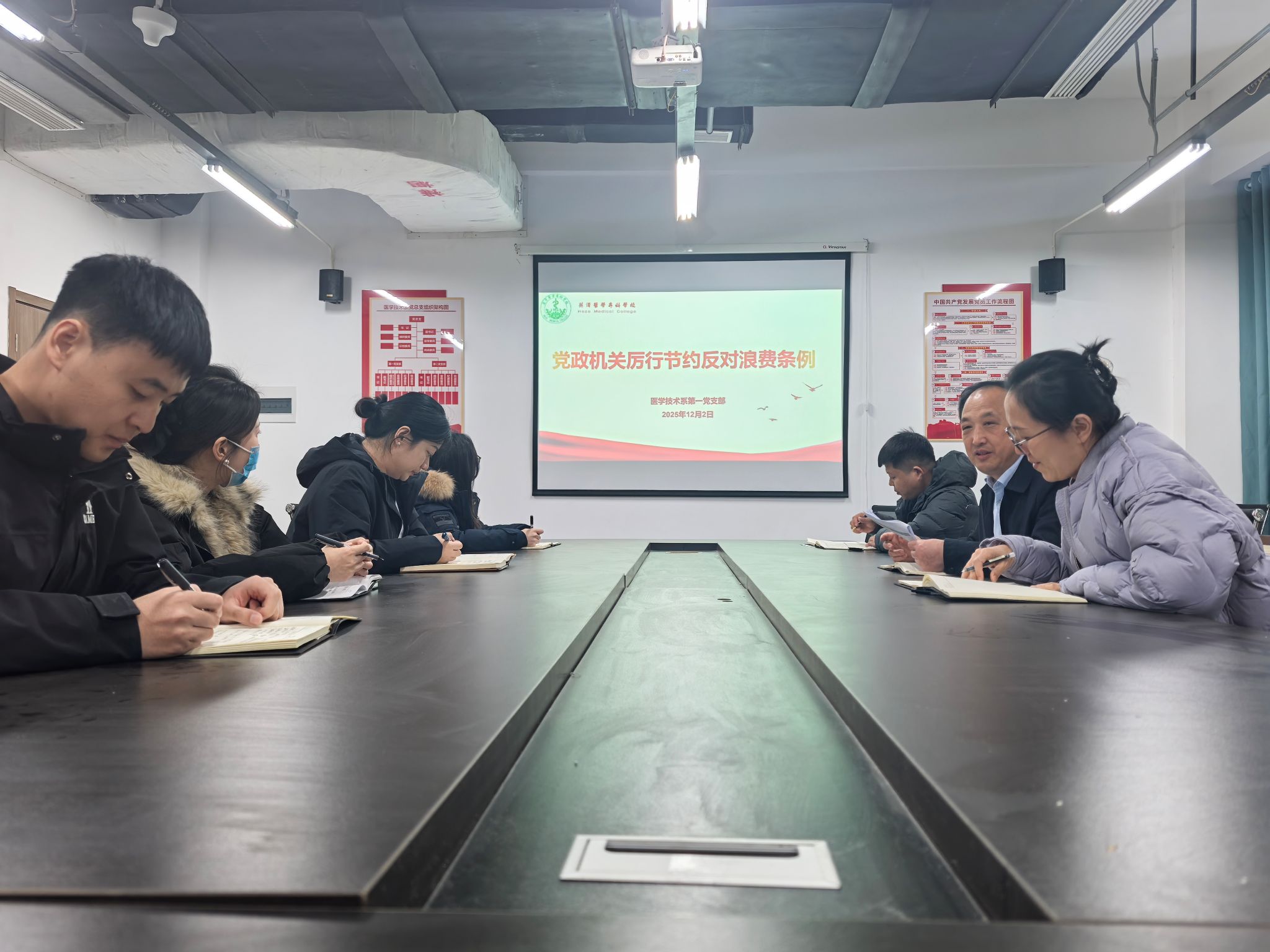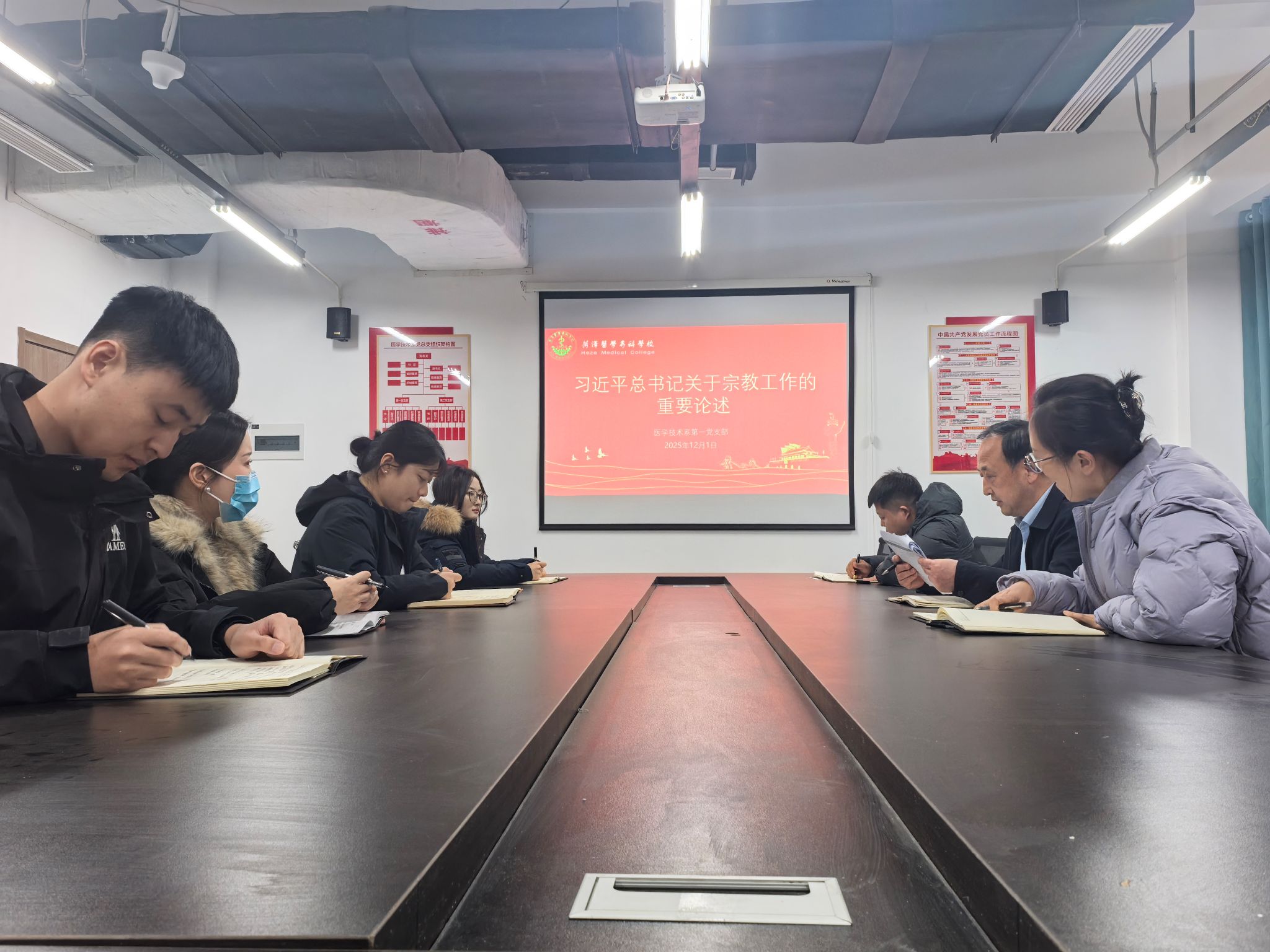 12月2日,菏泽医学专科学校医学技术系第一党支部召开党员会议,围绕习近平总书记关于宗教工作的重要论述、意识形态工作纪律要求及《党政机关厉行节约反对浪费条例》等内容开展专题学习。会议由系党总支书记牛家峰主持,支部全体党员参加。