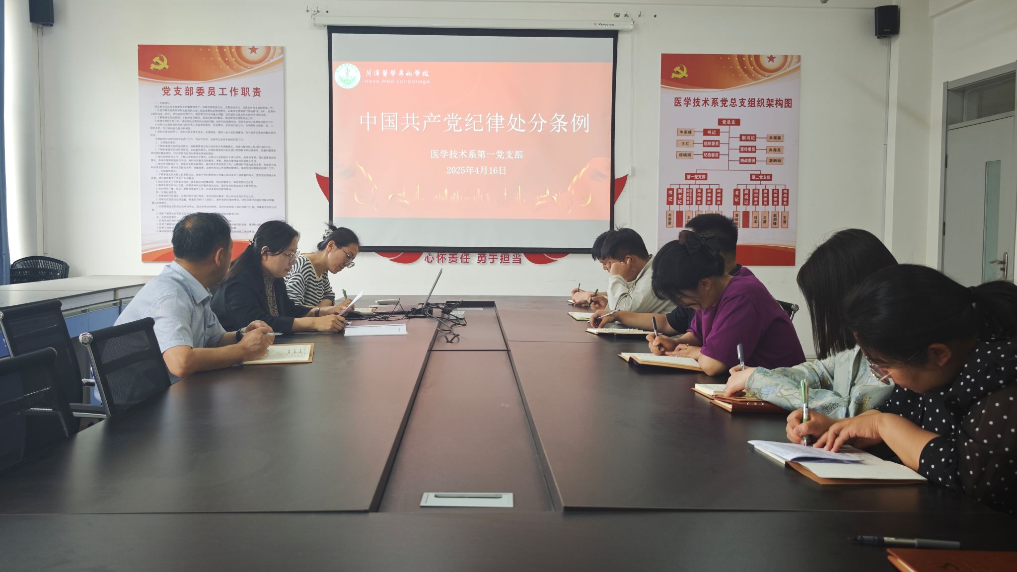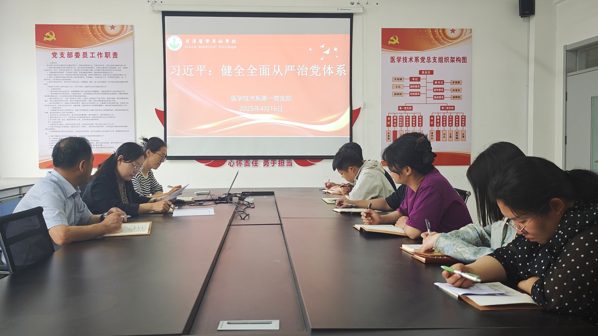 为持续强化理论武装,严明党的纪律规矩,不断提升党支部建设的规范化、科学化水平,4月16日下午,菏泽医学专科学校医学技术系第一党支部在党员活动室(5607)召开全体党员大会,集中开展专题学习。会议由党支部书记牟翠荣同志主持。
