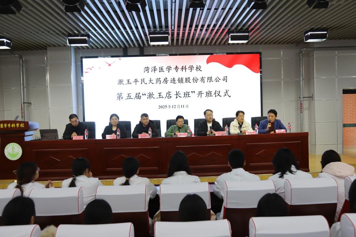 2025年12月11日,菏泽医专第五届“漱玉店长班”开班仪式成功举办。菏泽漱玉平民大药房总经理艾金堂、菏泽漱玉平民大药房副总经理张彦华、漱玉平民商学院培训经理李道治、药学与检验系党总支书记田文革、药学与检验系副主任张秀华、校企合作与培训就业处副处长王宗军、药学与检验系党总支副书记李睿以及24名漱玉平民店长班成员共同参与。