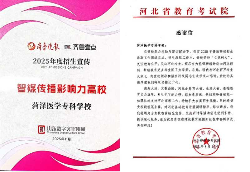 2025年,我校招生工作再添新荣誉。凭借扎实的办法举措、优异的招生成果和良好的社会口碑,学校被山东数字文化集团评为“2025年度招生宣传智媒传播影响力高校”。河北省教育考试院向我校致信感谢,充分体现了对学校招生工作的高度认可。