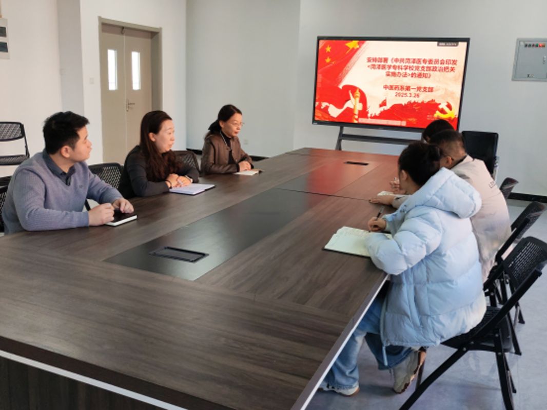 为深入贯彻落实全面从严治党要求,进一步规范发展党员工作流程,压实基层党组织责任,切实提升学生党员发展质量,2025年3月26日,中医药系第一党支部召开专题会议,传达学习《中共菏泽医专委员会印发〈菏泽医学专科学校发展党员工作责任追究办法〉的通知》,并严格落实“第一议题”制度。会议由党支部书记杨茜主持,全体党员教师参加。