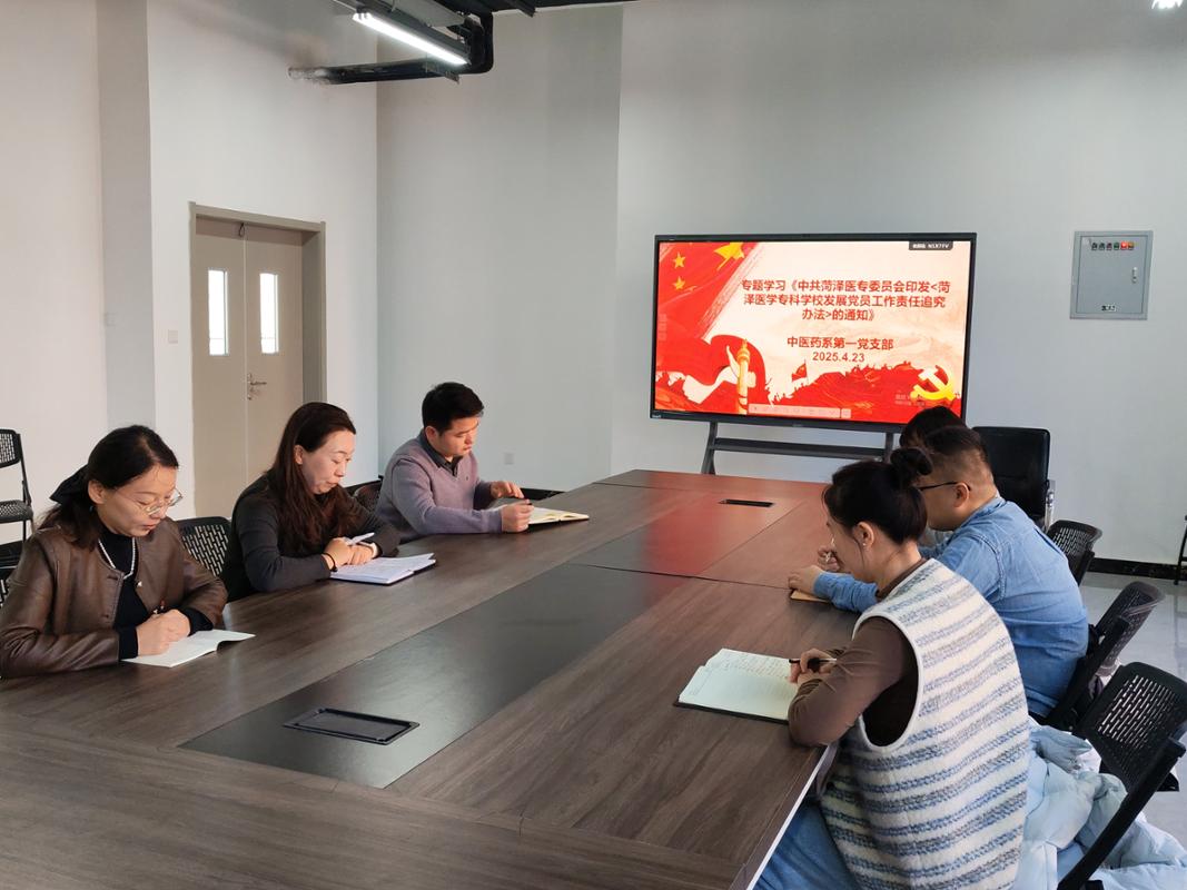 为深入学习贯彻党的二十大精神,全面落实新时代党的建设总要求,切实把党的政治建设摆在首位,2025年4月23日下午,中医药系第一党支部召开支部会议,专题学习《中共菏泽医专委员会印发〈菏泽医学专科学校发展党员工作责任追究办法〉的通知》(以下简称《办法》)。会议由党支部书记杨茜同志主持,支部全体党员参会。