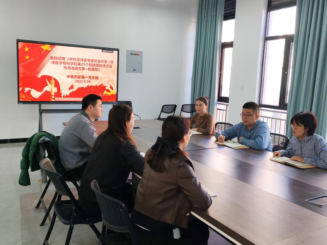 为深入贯彻落实党的二十大精神,全面推动新时代党的民族工作高质量发展,根据《中共菏泽医专委员会印发〈菏泽医学专科学校第25个民族团结进步宣传月活动方案〉的通知》要求,2025年9月24日,中医药系第一党支部召开专题会议,安排部署本支部民族团结进步宣传月相关工作,并严格落实“第一议题”制度。会议由党支部书记杨茜同志主持,全体党员教师参加。