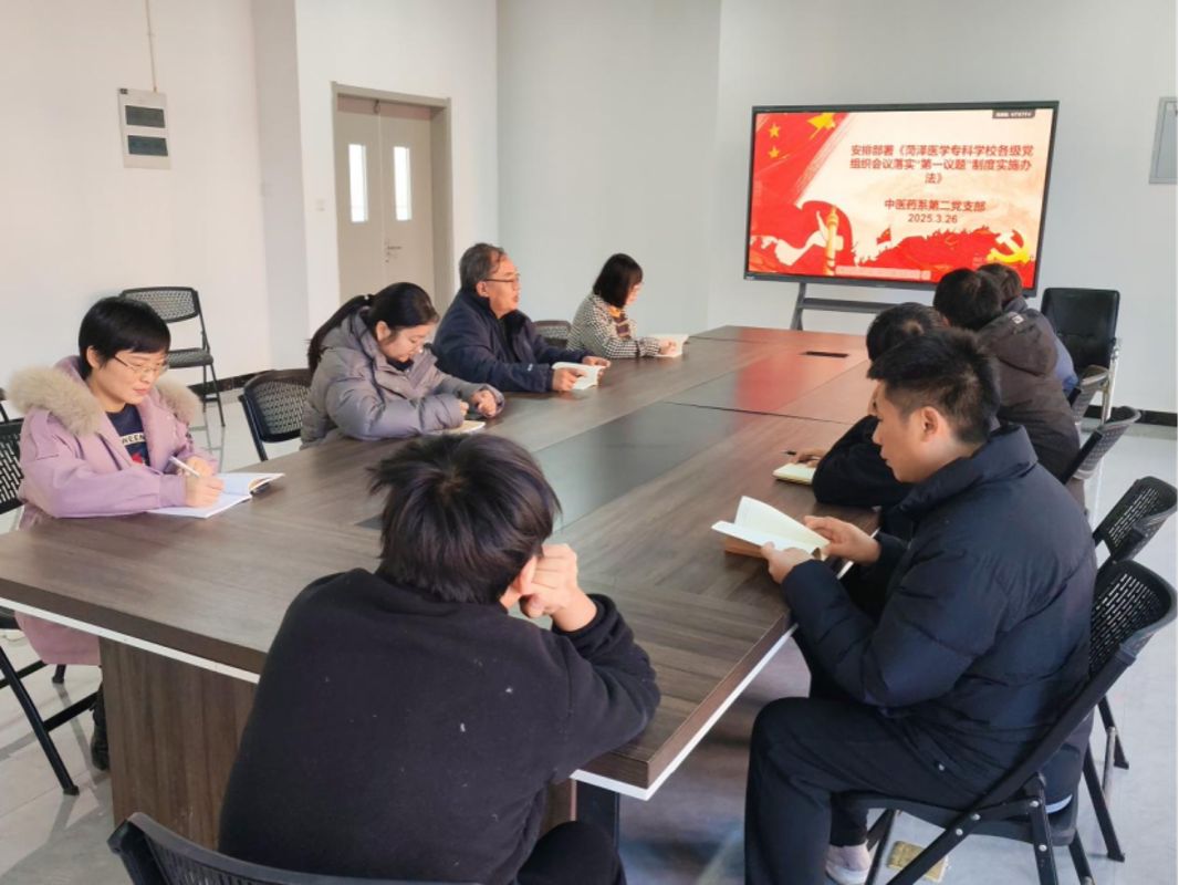 2025年3月26日,中医药系第二党支部召开专题部署会,正式印发《中医药系第二党支部“第一议题”制度实施办法》(以下简称《办法》),将学习贯彻习近平新时代中国特色社会主义思想作为强化支部政治建设的核心抓手,通过“制度筑基、特色赋能、闭环落实”三维发力,推动理论学习与中医药教育事业发展深度融合,为支部党建提质增效注入强劲动力。
